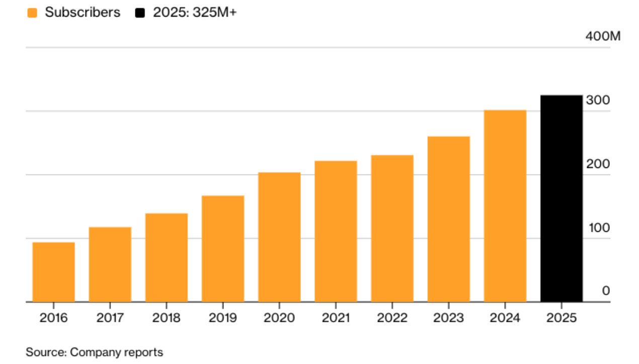 → o número de assinantes cresceu 8% a/a e bateu os 325 milhões pela primeira vez.