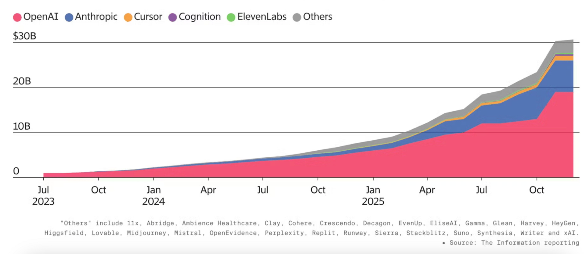 As Top 2 (OpenAI e Anthropic) respondem por 85% da receita total das 32 empresas.