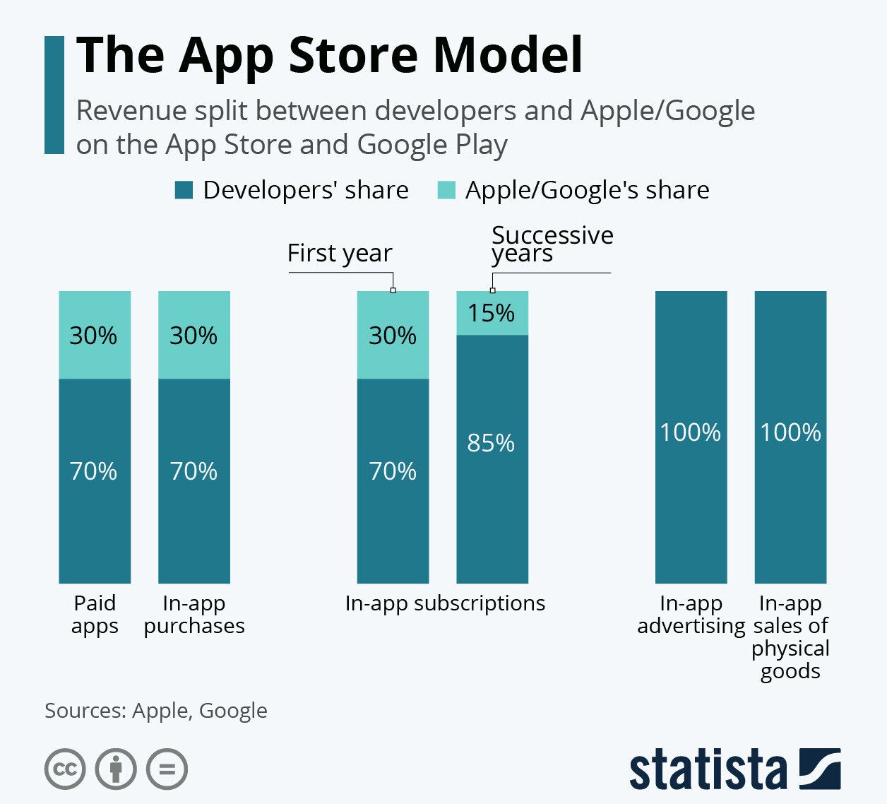 Quase 15 anos depois e a indústria de apps mobile atinge ~$133 bilhões ao ano.Destes, cerca de ~$90bi é iOS/Apple e os restantes ~$40bi são Android/Google.Apesar do iOS ter um marketshare menor, seu público-alvo (classe alta de países de primeiro mundo) consome mais que o público Android (classe média-baixa de países de segundo e terceiro mundo).