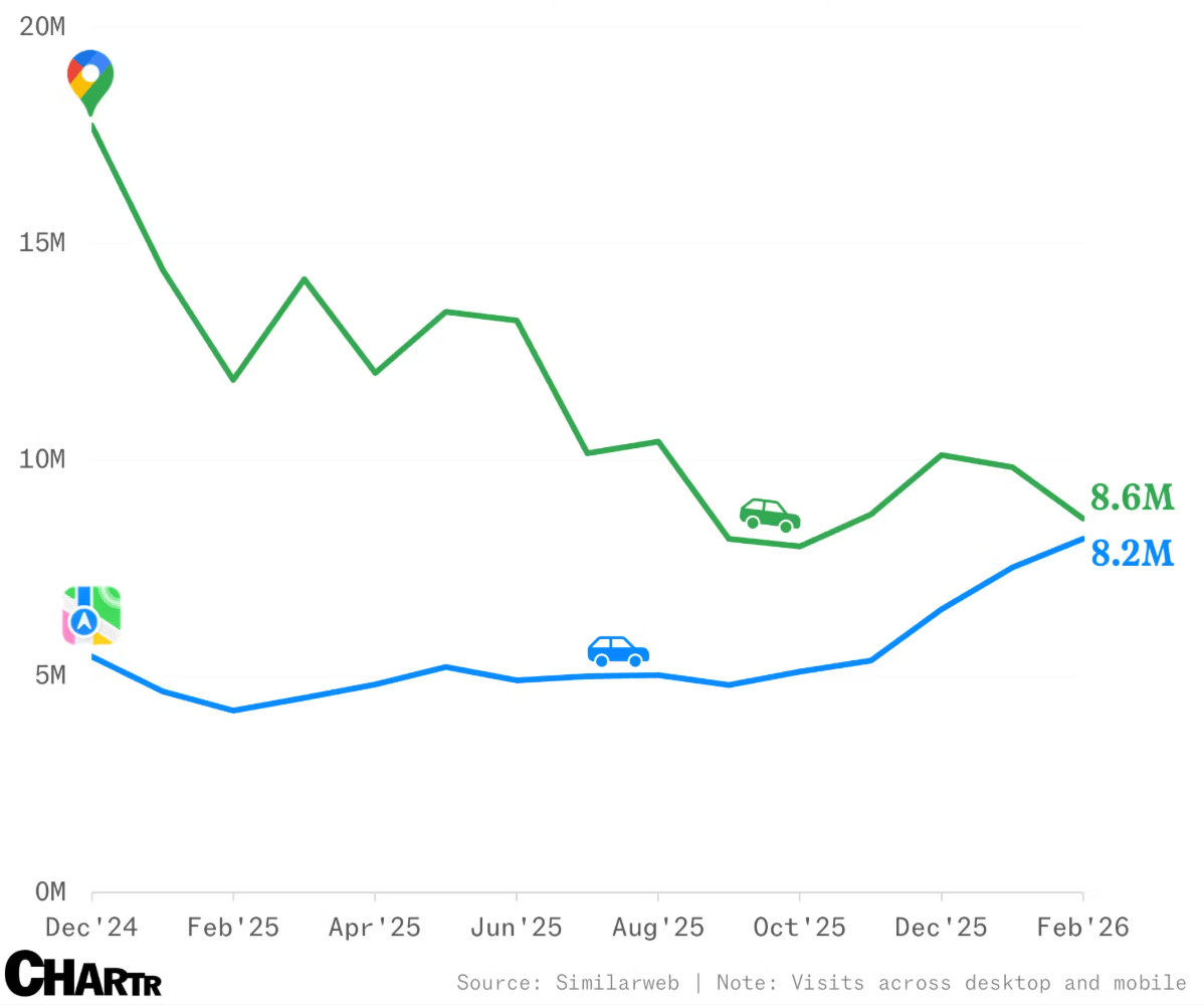 Há poucos anos — e durante muitos outros anos antes disso — o Google Maps era o líder absoluto quando o assunto eram mapas de navegação. Quase 18 milhões de americanos optavam pelos mapas do Google todos os meses, contra ~5 milhões que preferiam os da Apple. Mas o gap que já foi de 13 milhões agora é de meros 400k acessos.