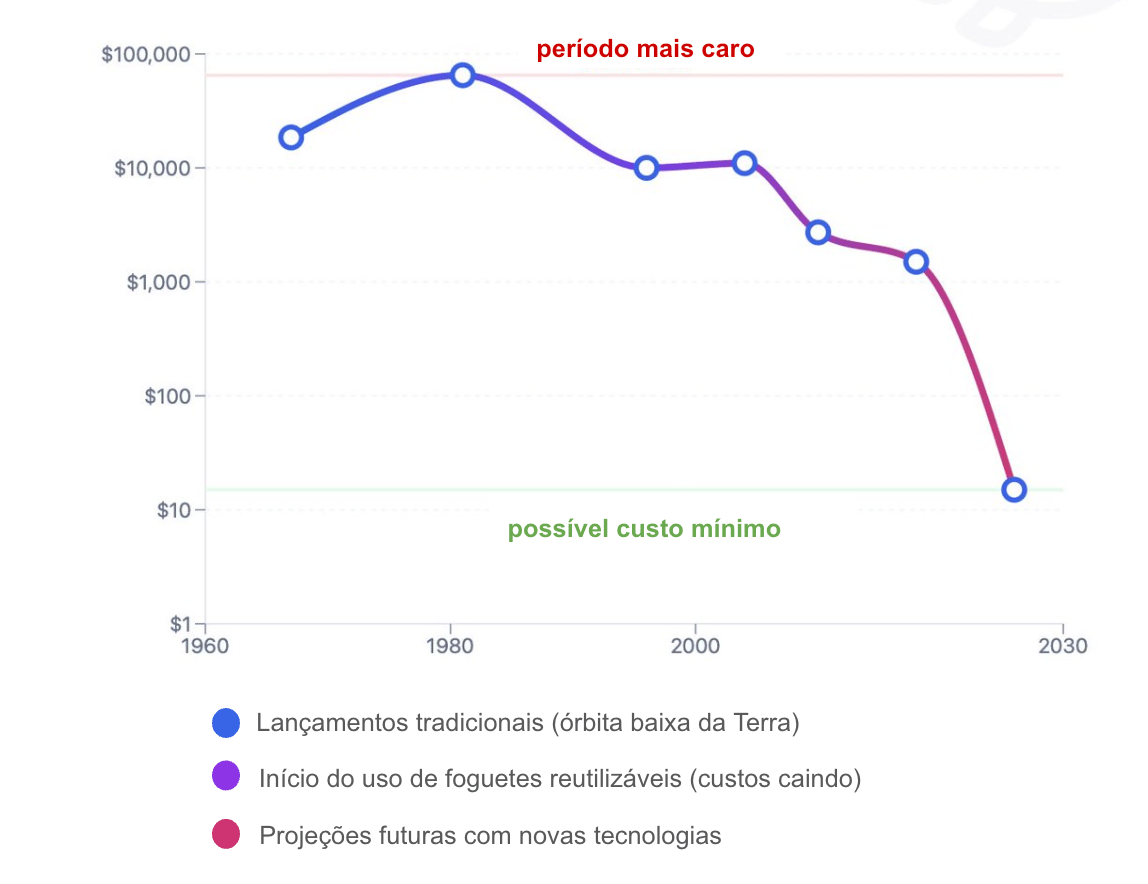 A queda de +4.000x no custo foi possível porque a SpaceX tornou foguetes reutilizáveis.