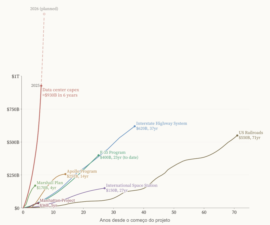 Para entender a dimensão do quanto as big techs estão investindo em datacenters de IA, vale olhar para os outros megaprojetos dos últimos 150 anos — todos medidos da mesma forma: gasto anual como % do PIB americano, acumulado ao longo dos anos.
