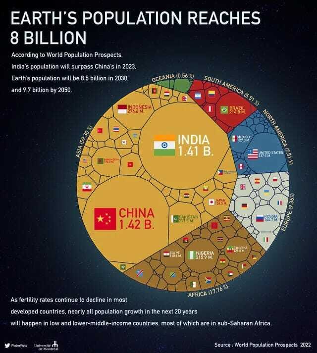Hoje eu aprendi: que a população mundial atingiu 8 bilhões de pessoas, pela primeira vez, ontem. Os 9 bilhões estão projetados para acontecer em 2037 e os 10 bilhões apenas em 2058 - indicando um declínio no crescimento populacional.