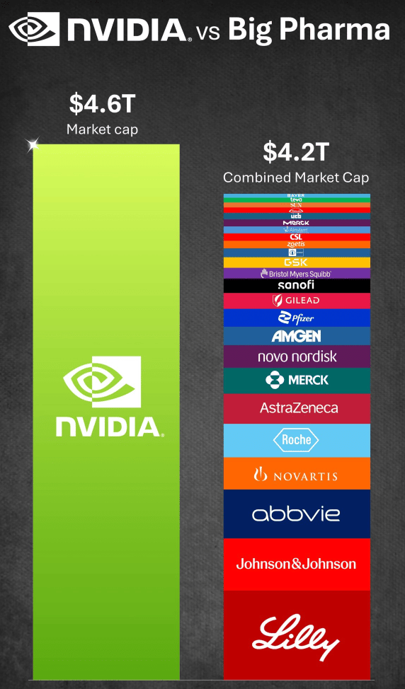 Ao se tornar a primeira empresa na história a ultrapassar a marca dos US$ 4,5 trilhões de valor de mercado, a maior fabricante de chips do mundo também ultrapassou o valor de mercado de TODAS as empresas farmacêuticas do mundo, somadas!