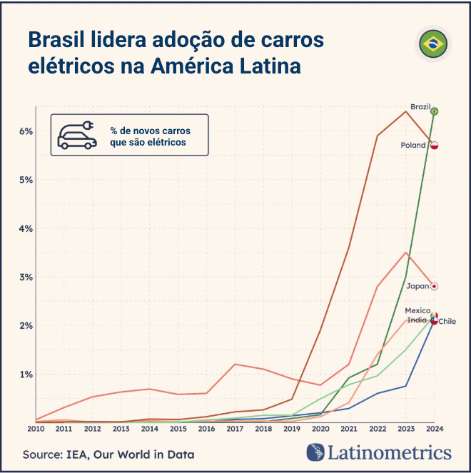 Com 125.000 veículos elétricos vendidos no ano passado, o Brasil está se tornando a maior potência entre os países da América Latina – mas não apenas. A porcentagem de novos carros vendidos que são elétricos já passa países como Polônia, Japão e Índia.