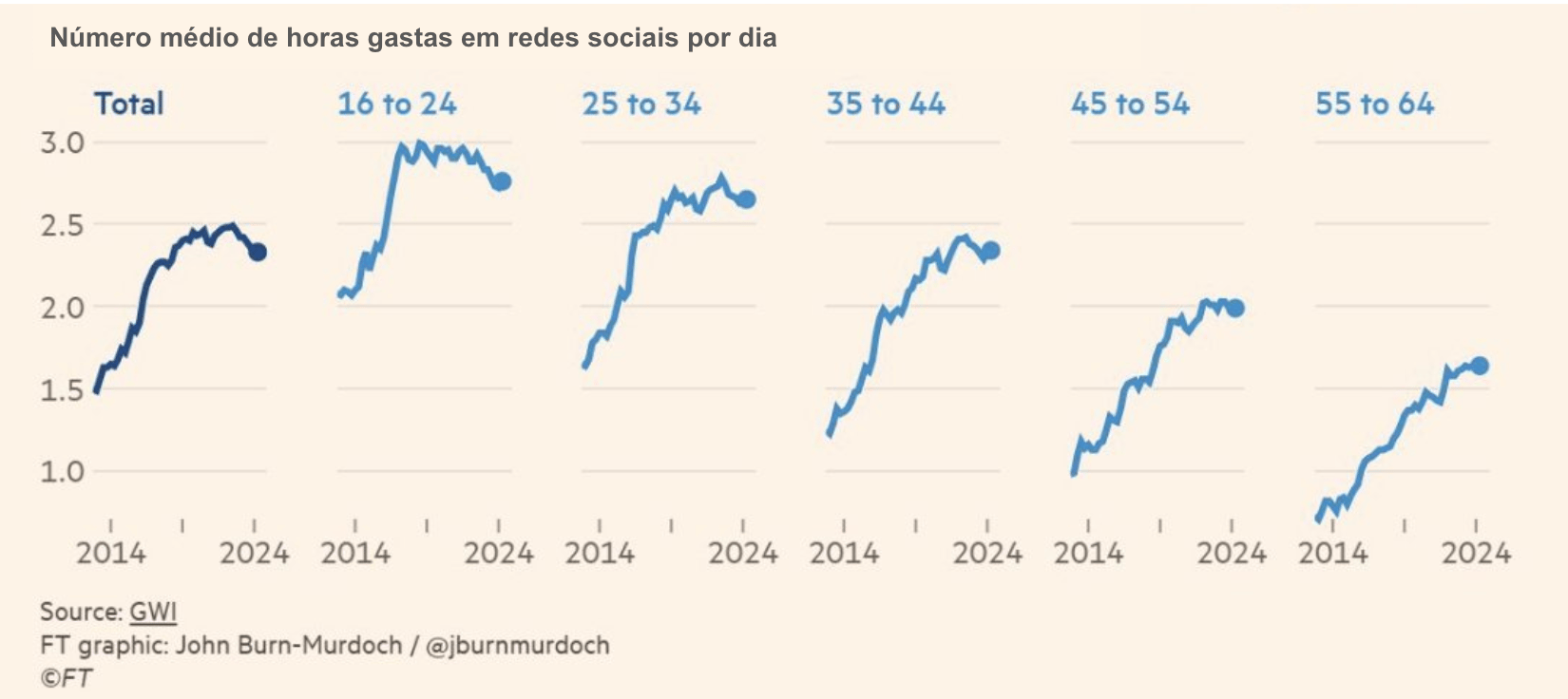 Apesar de influenciar eleições, mover opiniões, ser palco dos CEOs, megafone de políticos e de fazer o Brasil todo, querendo ou não, saber sobre a vida da Virgínia… o tempo médio gasto nas redes sociais está em declínio constante desde 2022, quando atingiu o seu pico.