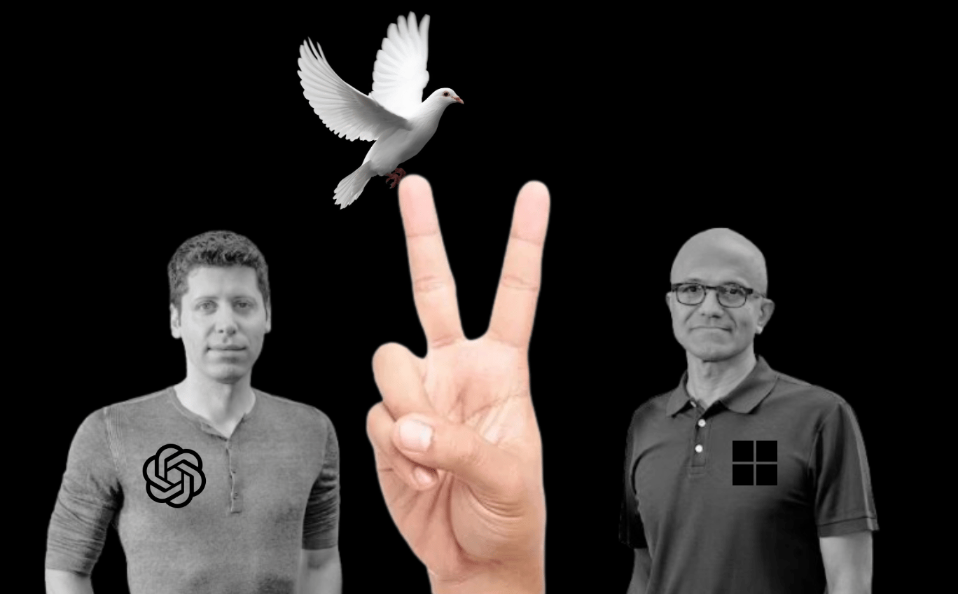 A queda de braço entre a OpenAI e a Microsoft parece finalmente ter chegado ao fim, com as duas empresas apertando a mão e fazendo um sinal de paz e amor para o mercado.