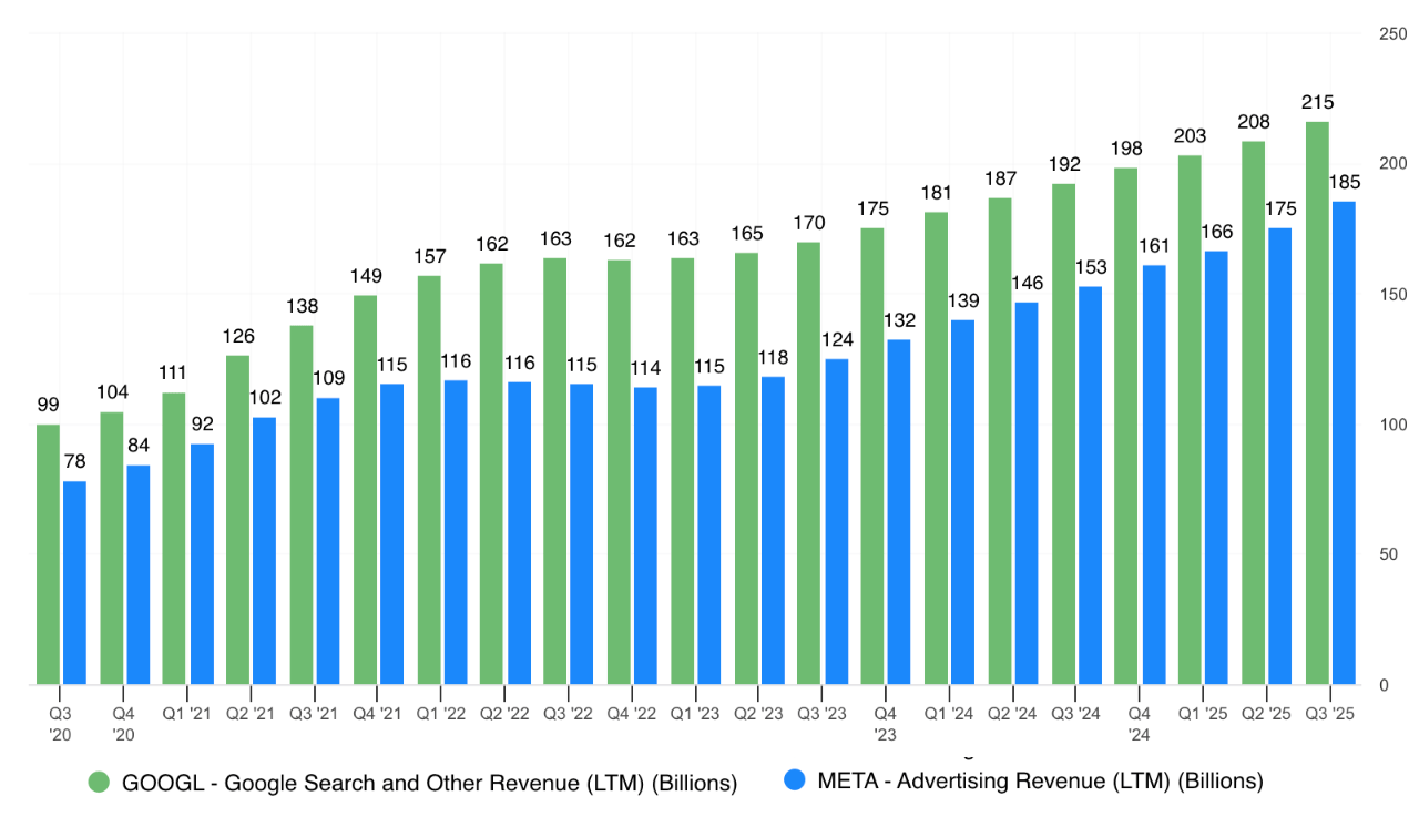 Considerando que o Google atualmente gera US$ 215 bilhões por trimestre e a Meta gera US$ 185 bilhões no mesmo período, se nenhuma mudança acontecer a Meta levaria ~8 anos para ultrapassar o Google e tomar a primeira posição pela primeira vez.