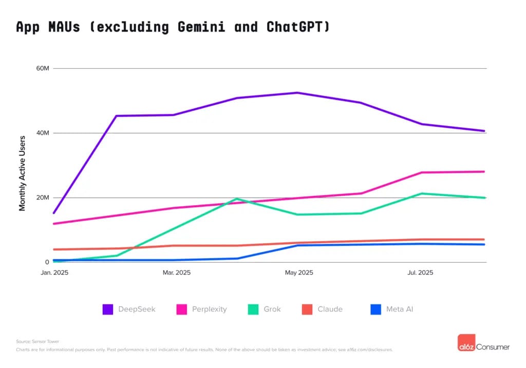 O ChatGPT é o soberano dos chatbots, com o Gemini tentando chegar na cola. No ranking publicado pela a16z, a disputa é pra ver quem fica com a medalha de bronze e abocanha alguns dos bilhões de dólares que restam no mercado.