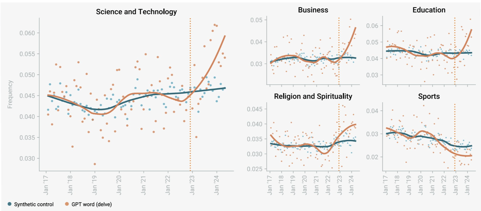 O resultado: palavras como delve, underscore, comprehend, bolster e boast cresceram 25–50% na fala humana – e não em leitura de scripts de IA, mas em conversas espontâneas, onde as pessoas internalizaram o vocabulário do chatbot sem nem notar.