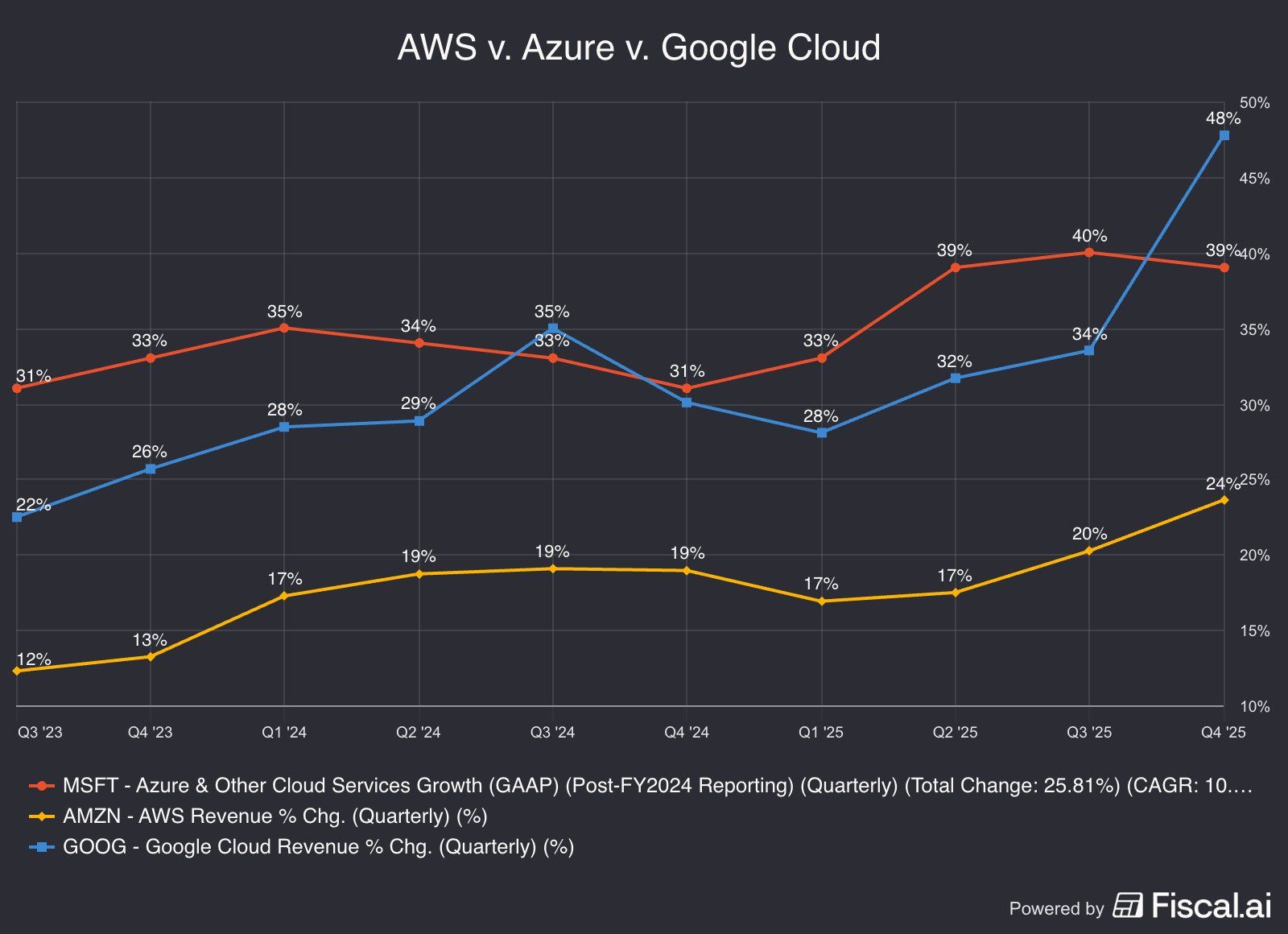 No setor de hyperscalers, o Google Cloud foi o vencedor disparado do último trimestre (com ~50% de crescimento). A Amazon ficou com o segundo lugar com os nada tímidos ~25% e a Microsoft foi a única que diminuiu o ritmo de crescimento — de 40% para 39%.