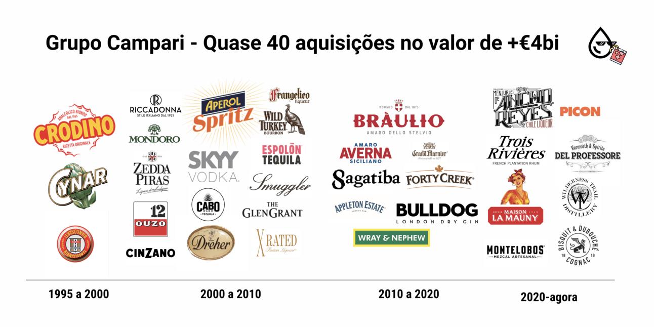 Criado em 1860 em Milão, na Itália, o Grupo Campari ($BIT:CPR) tem 160 anos de história, e está presente nas mesas de bares e drinks de 190 países ao redor do mundo. Mas nem só de Campari vive o grupo Campari. Depois de 135 anos de história, em 1995 o grupo abriu a carteira e começou a aquisição de outras marcas. Desde então, foram ~40 novas garrafas adicionadas ao portfólio, entre elas: Aperol (22% das vendas), Campari (11%), Wild Turkey (8%), SKYY (5%), Espolòn (6%) e Grand Marnier (7%).